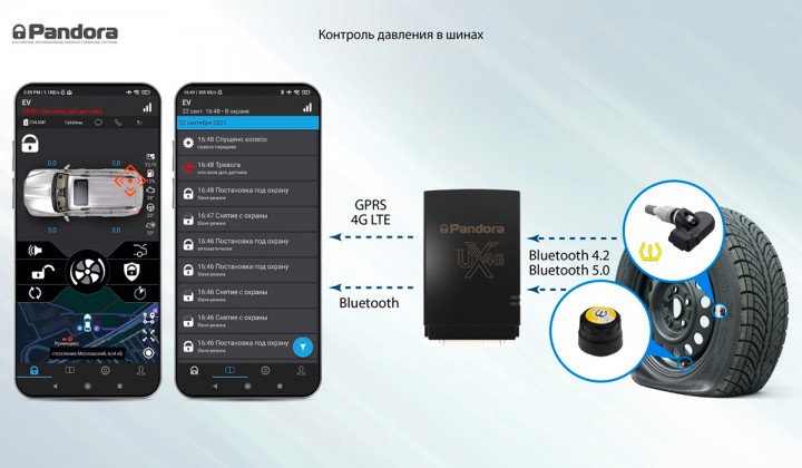 Pandora представляет новую функцию современных телеметрических сигнализаций - поддержку внешних и внутренних датчиков давления шин по Bluetooth.